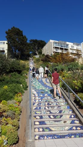 Dimanche, on est parti à l’Ouest (?) pour aller voir les Tiled Steps. Ce sont des escaliers qui ont été décorées par des artistes autour d’un projet communautaire qui a impliqué tous les habitants du quartier. C’est un peu excentré mais très joli ! Et qui dit escaliers, dit… point du vue ! On a donc rejoint Grand View Park, qui offre un joli point de vue là aussi presque à 360° sur Downtown au loin, le Golden Gate Park et sur l’océan… Enfin en principe parce que là on a eu droit à l’arrivée du brouillard, le fameux Karl.