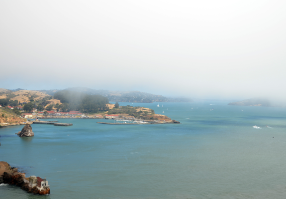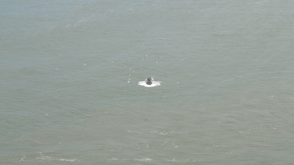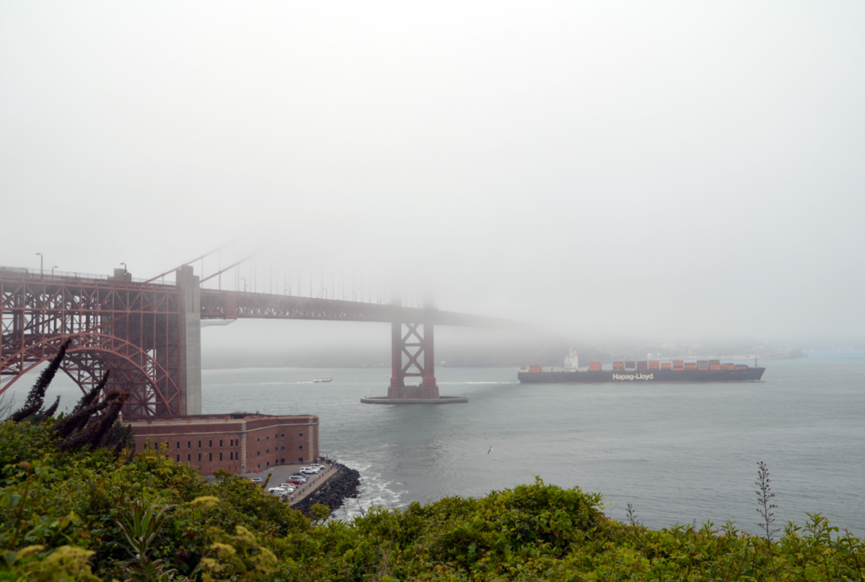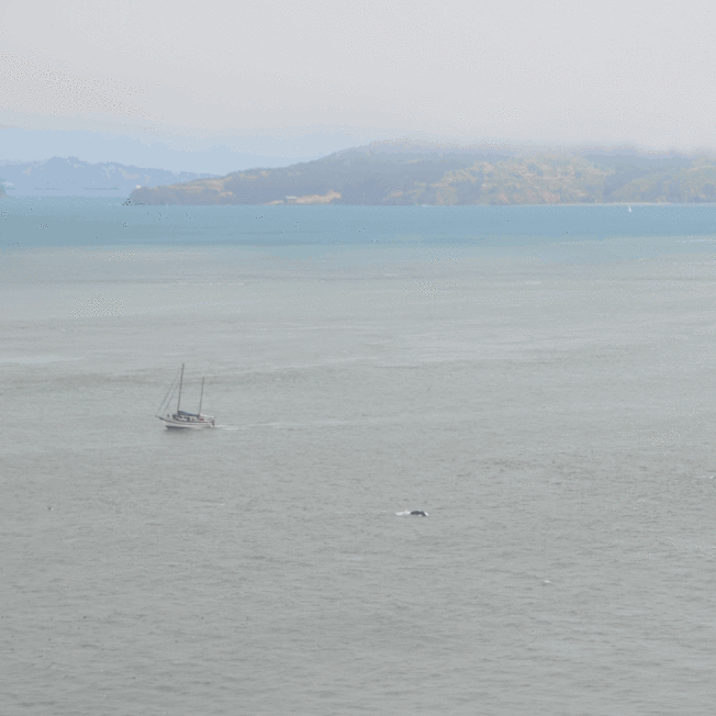 Cette fois-ci, il y a avait donc un bon brouillard bien épais, comme on en avait pas encore vu. Les tours disparaissent au grès de la progression du fog et c’est plutôt très joli ! On a été plutôt gâtés ce jour-là donc, puisqu’on a eu droit à deux spectacles ! Le pont embrumé en haut et les baleines en bas ! Et oui, le retour des baleines ! Avant le pont, et puis une fois dessus, on a eu droit à un joli festival de jets d’eau. A priori, elles étaient trois et on a pu les suivre un peu tout le long de notre traversée. Quelques sea lions se sont aussi joints à la fête ! Bref, c’était un très joli moment et on a bien du rester 1h30 à admirer ce joli ballet dans le détroit du Golden Gate.