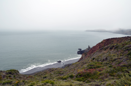 Vient ensuite notre randonnée à proprement parlée. On suit le Coastal Trail, avec un petit détour dans le Slacker Ridge Trail qui offre un joli point de vue sur le pont sur le brouillard. Ensuite, on ira admirer de loin la Black Sand Beach à laquelle la météo a donné un air très dramatique ! On y reviendra un jour pour voir ce que ça donne sous le soleil! Les chemins sont bien faits, bien balisés et plutôt agréables. Ça monte, ça descend mais sans être trop difficile. On se trouve entre brouillard et soleil, parfois en plein vent, mais toujours avec de très jolis paysages à admirer. On voit aussi beaucoup d’oiseaux, des rapaces et des cailles, mais pas trop de gens ce qui n’est pas plus mal ! La route de la côte est plus populaire en voiture ?