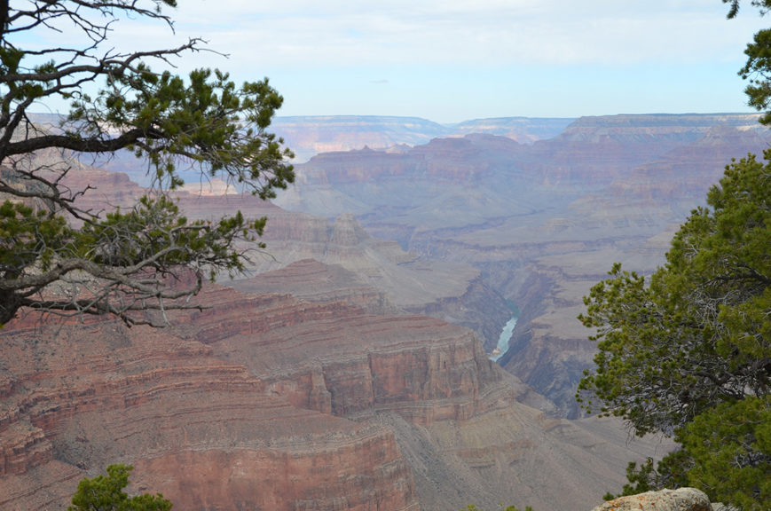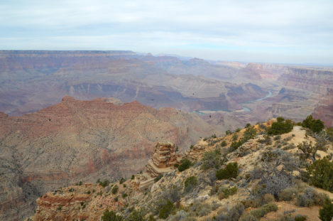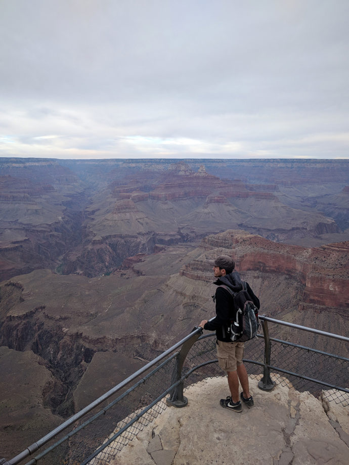 Après avoir traversé une partie de la forêt, nous voici enfin à l’entrée du parc ! Une fois les cartes récupérées, on se dirige tout de suite au premier point de vue : Desert View et sa watchtower. Comme on roulait dans la forêt auparavant, c’est la première vue dégagée qu’on aura sur le canyon. Le ciel est bien gris mais lorsque l’on arrive à la plateforme d’observation, on oublie rapidement ce détail.