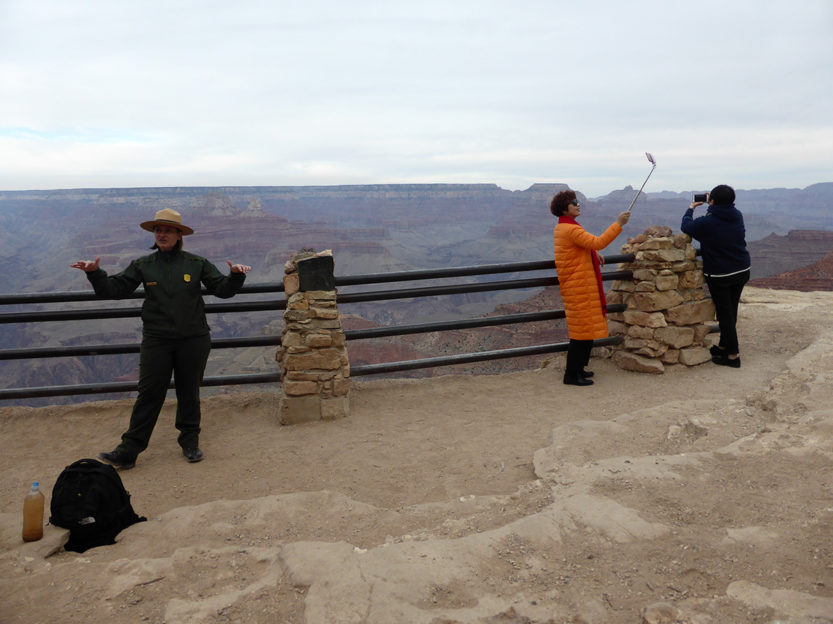 Au programme, une courte descente dans le canyon par l’un des fameux chemin de randonnée et surtout une longue exploration des bords du Canyon. Rendez-vous donc au village où une navette nous emmène à Hermit’s Rest, l’extrême limite est du parc sud. Pas que le canyon finisse là, mais au-delà de ce point, plus de route !